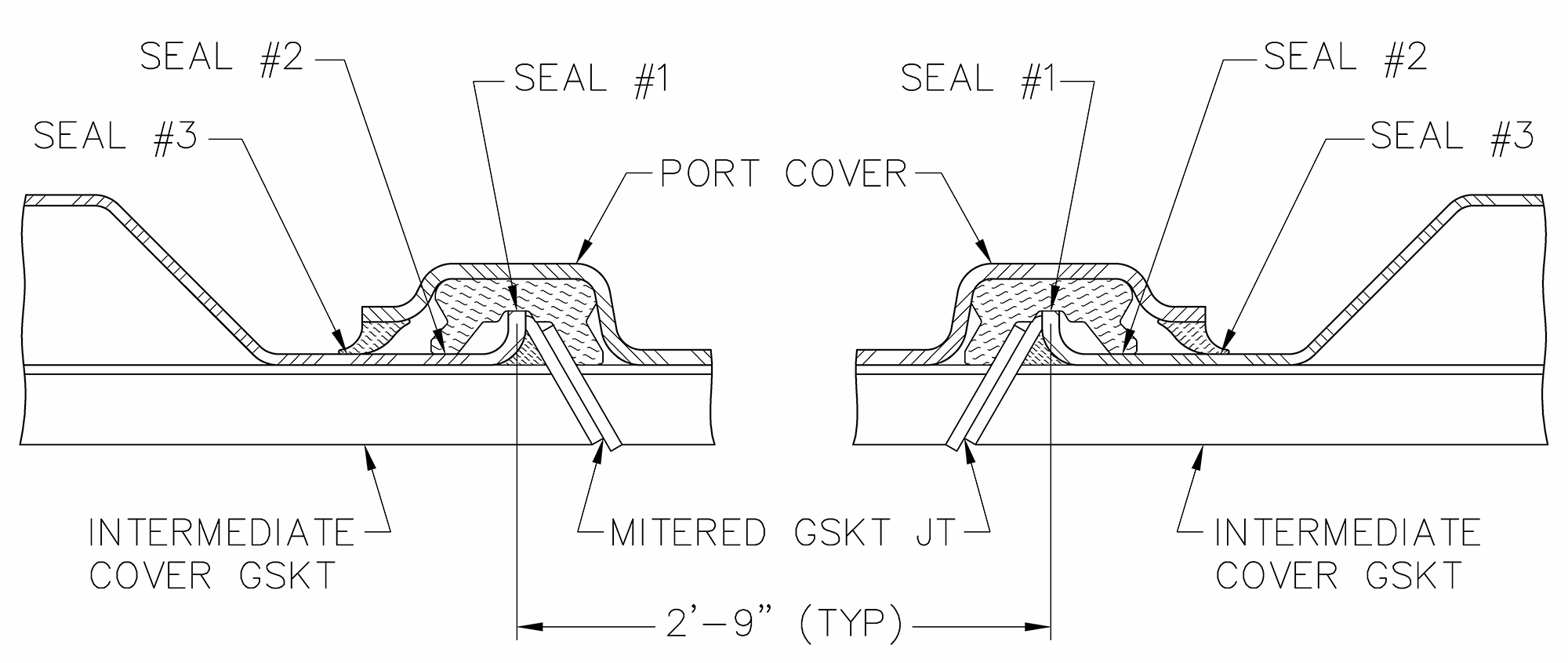 The Quantum Plus “Triple Seal” sealing system is the best sealing system in the industry. The transverse seal between covers or the “Triple Seal” begins with the seal created by the port cover overlap channel gasket sealing on the intermediate cover flange – Seal#1.  secondly, this same gasket creates another seal across the flat of the intermediate cover – Seal#2. Lastly, an additional port cover flange gasket creates yet another seal across the flat of the intermediate cover – Seal#3. Our hollow chamber longitudinal gasket typically creates up to ¾ of an inch compression between the cover and coaming. Additionally, to virtually eliminate the gaps in the longitudinal trough gasket between adjacent covers, a mitered gasket joint configuration is utilized – (Q+Miter).